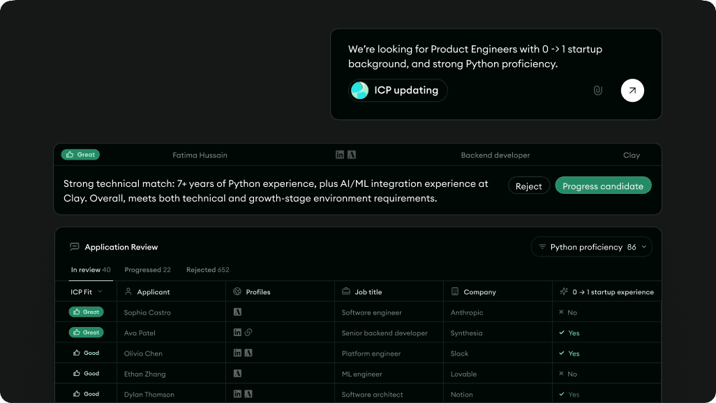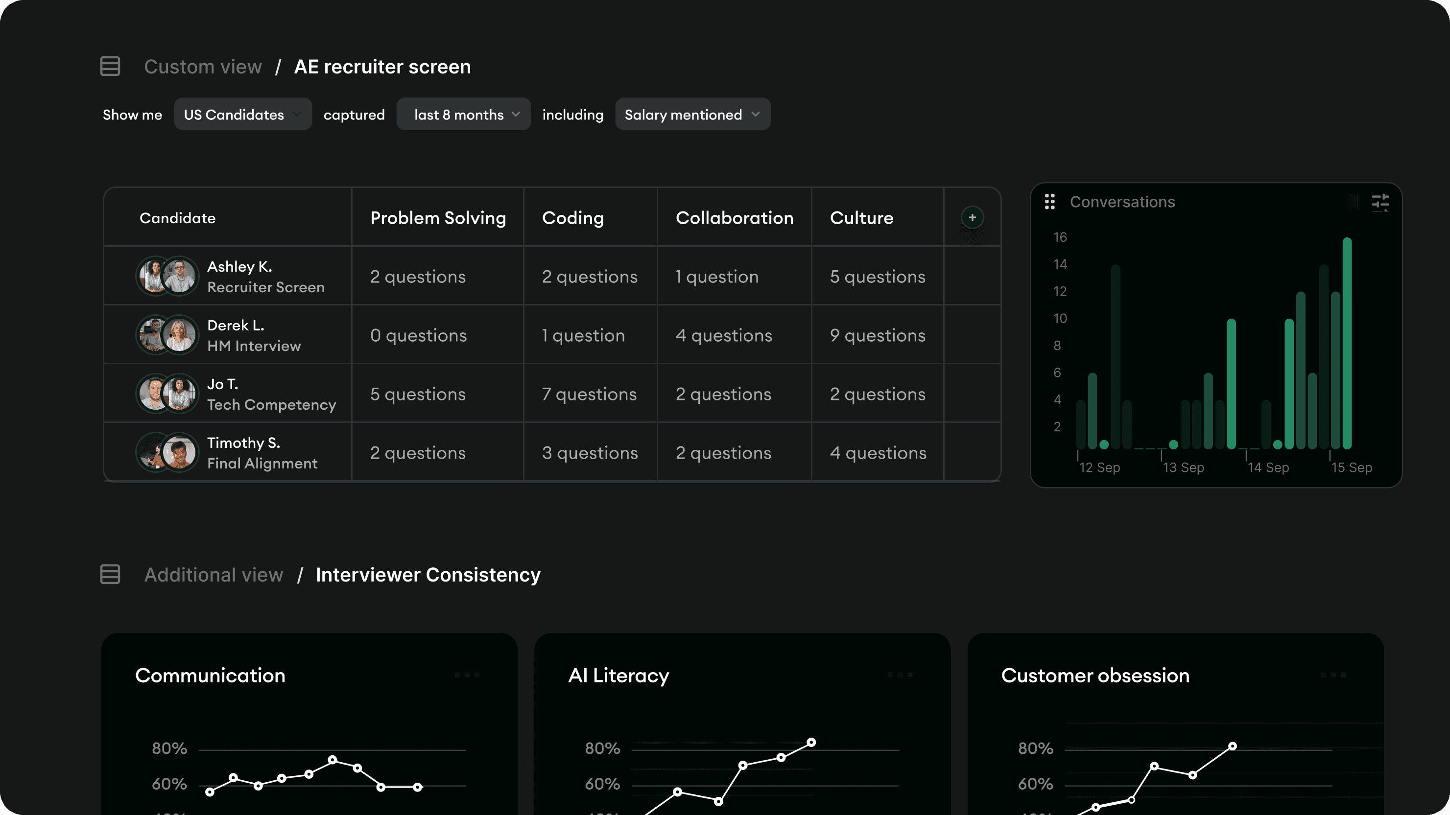One platform where recruiters, hiring managers, and AI agents share context, keeping everyone aligned on criteria, calibrated on candidates, and moving in the same direction.