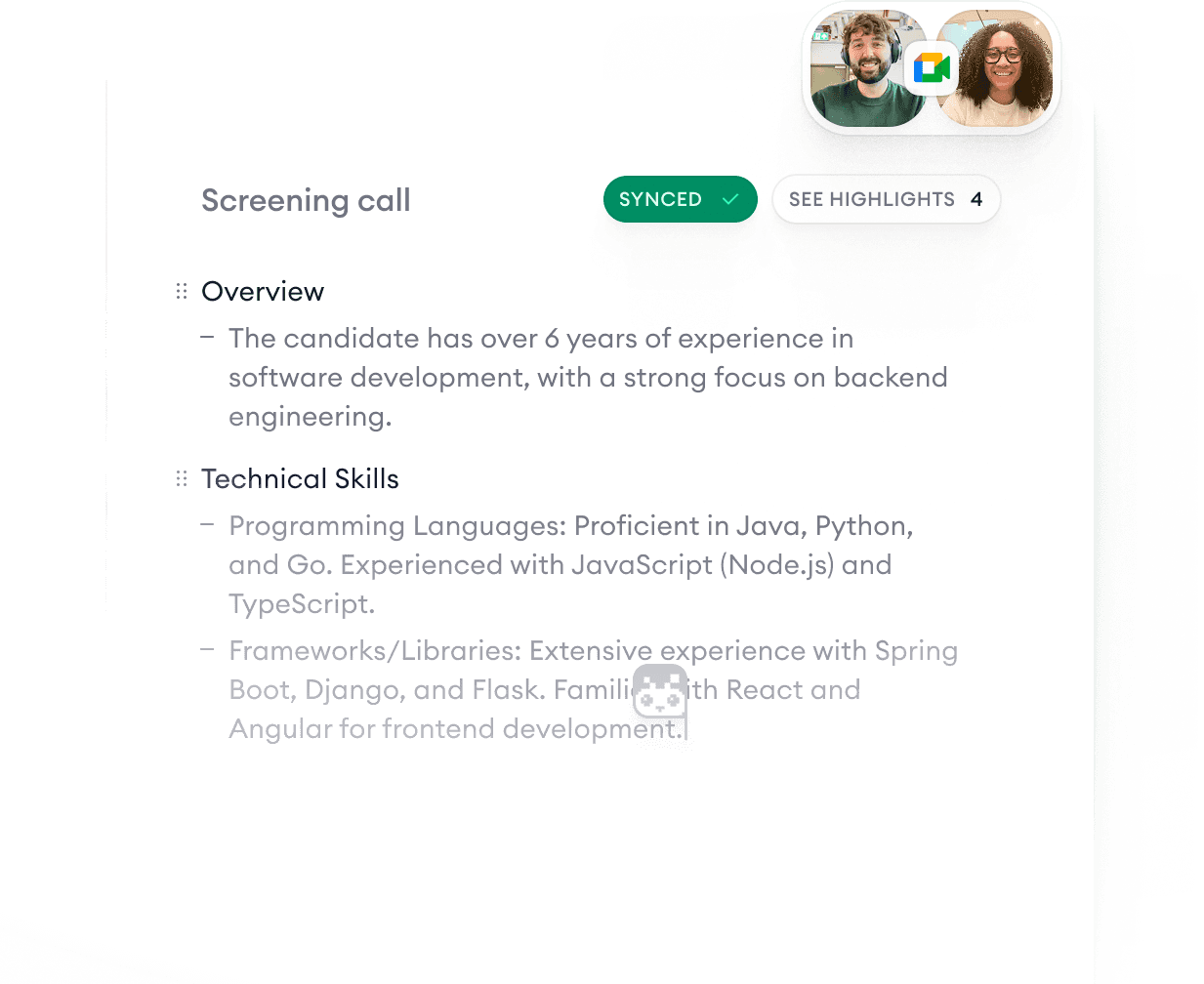 Generate structured notes and scorecards automatically, so recruiters don't have to chase busy teams and candidates aren't left waiting.
