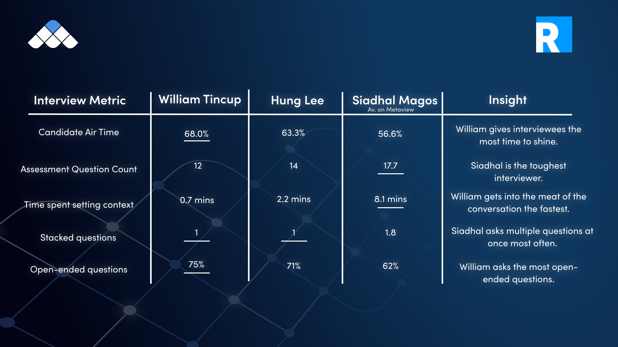 So, we ran the Use Case episode through our Interview Intelligence engine and compared William's Interview Metrics to Hung's recent interview with Siadhal as well as to Siadhal’s average on Metaview. Here's what the data showed this time: