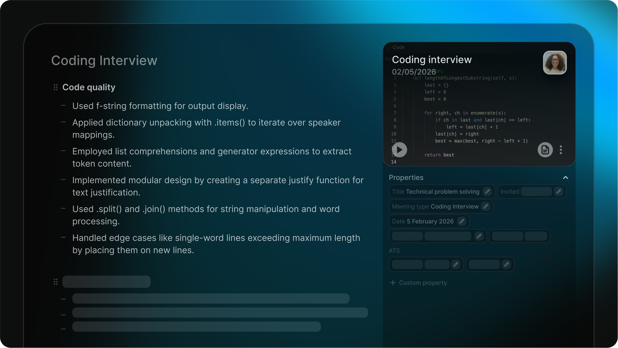 Coding tasks are a critical part of tech hiring. Metaview now reads code shared during screenshares, and generates structured notes including: