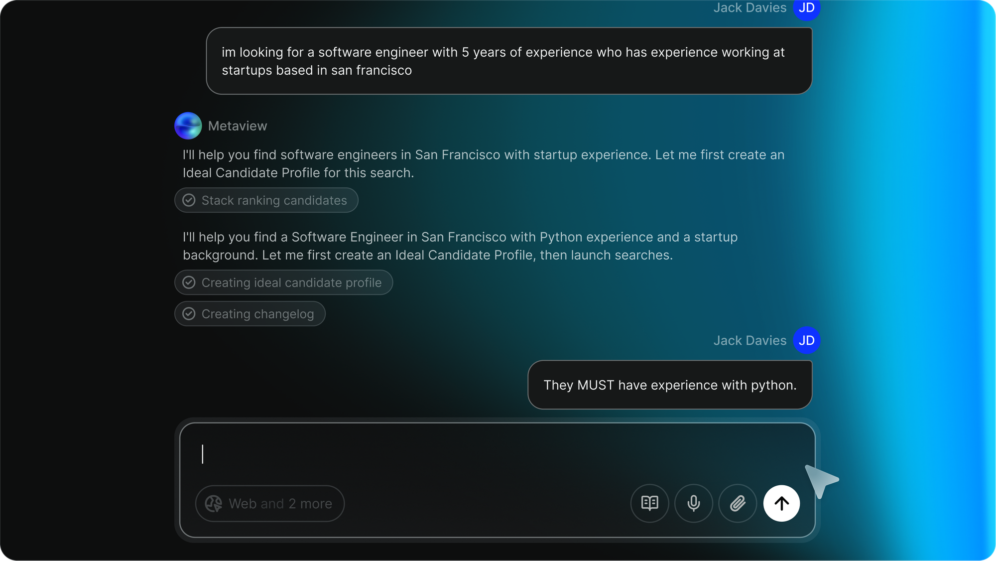 You can now adjust your sourcing criteria mid-search, and Metaview’s AI agents will update accordingly. You save time (and brain bandwidth), and help the AI zero in even faster.