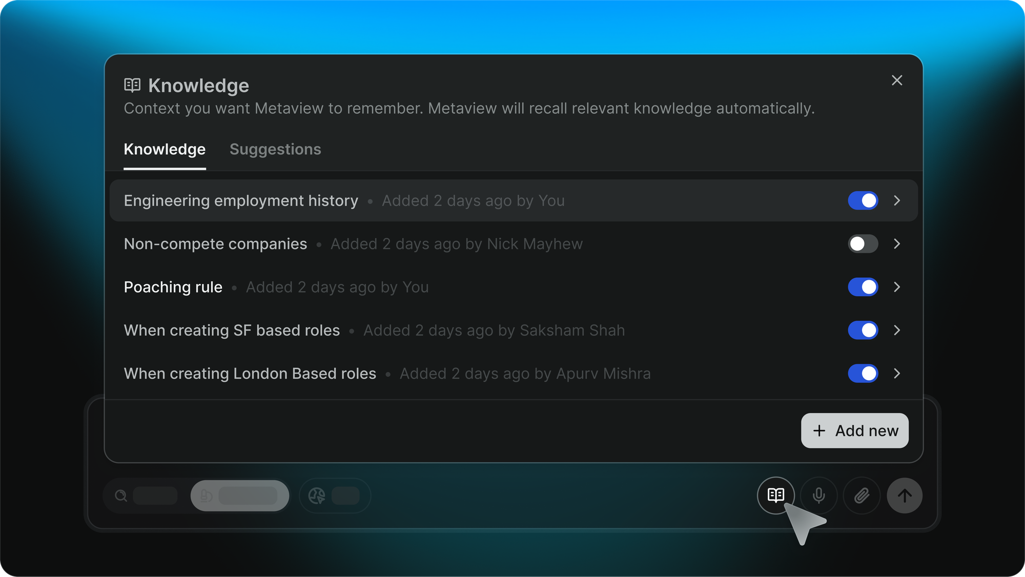 And Metaview agents will suggest new knowledge items as you search. When it notices a pattern, you’ll see a prompt to save it. Just accept or reject with a click.