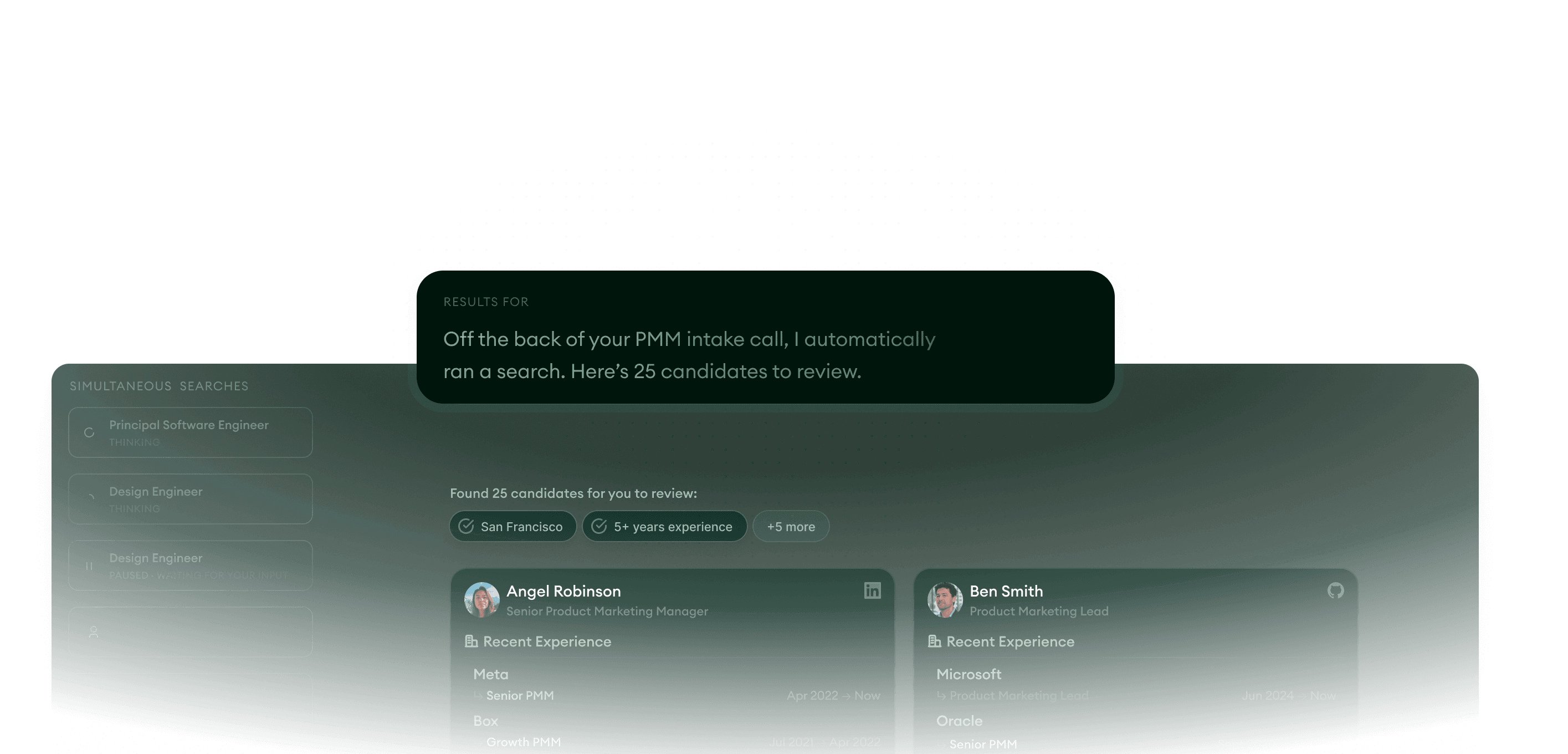 No rigid filters. Metaview understands anything you give it—JDs, resumes, past candidates, even natural language—so it can think and search like you.